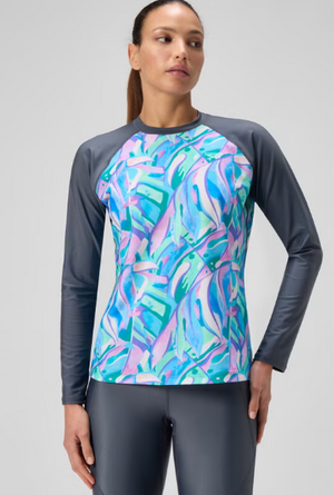 Reach for our colourful printed Long-Sleeve Swim Tee when a day on the beach beckons or when coverage is a priority. The comfy pull-on design has a relaxed fit and includes flatlock seams for a chafe-free fit. Taking it to the pool? Our EnduraBrite fabric is engineered with 4-way stretch and CREORA® HighClo™ for high chlorine resistance and superb shape retention. Body made of 82% Polyester, 18% Elastane (Creora® HighClo).